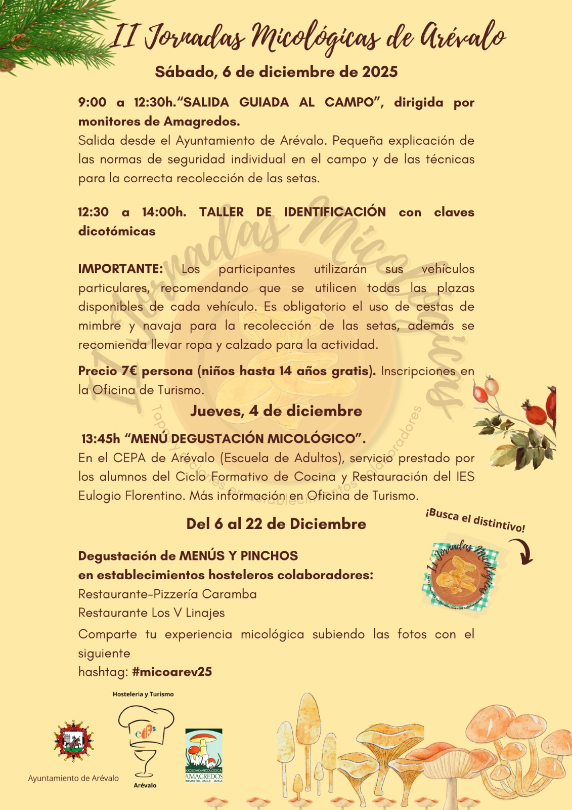 La programación continuará el sábado 6 de diciembre, con una salida guiada al campo entre las 9:00 y las 12:30 horas, desde el Ayuntamiento de Arévalo. La actividad incluirá una explicación sobre normas de seguridad en el medio natural y sobre técnicas adecuadas para la correcta recolección de setas.