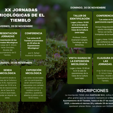 19:15 Conferencia "Las detas de El Tiemblo presentadas en 20 años de exposiciones Micoclógicas", por D. Rafael Aramendi Sánchez.